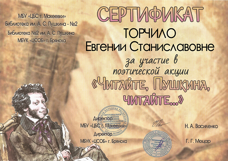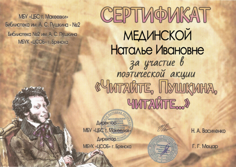 В поэтической акции «Читайте, Пушкина, читайте!» приняли участие Наталья Ивановна Мединская и Евгения Станиславовна Торчило. Это мероприятие было организовано библиотекой имени А.С. Пушкина № 2 МБУ «ЦБС г. Макеевки» и библиотекой № 2 имени А.С. Пушкина МБУК «ЦСОБ» города Брянска.