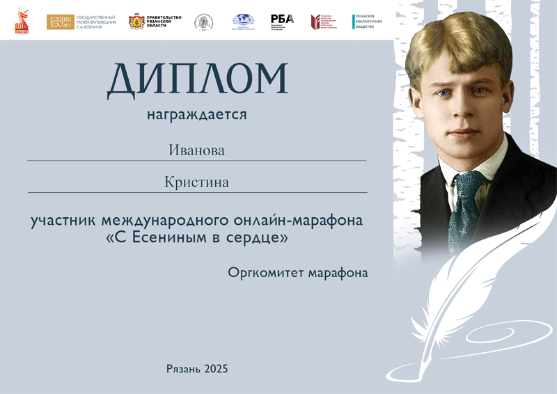Участники клуба «Любительский театр “Атмосфера”» отмечены сертификатами международного онлайн-марафона «С Есениным в сердце».