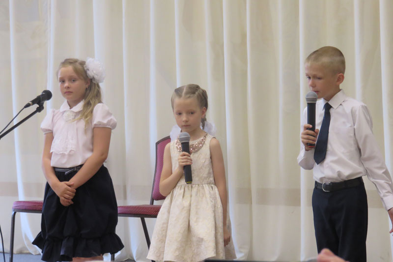 Выпускников поздравили и «первоклашки», напомнив тем, какими они были когда-то. В качестве музыкального подарка прозвучали произведения Жана Батиста Лойе («Соната», исполнитель Арина Черничкина, концертмейстер Анатолий Балашов), М. Товпеко («Маленький вальс», исполнитель Михаил Шувариков), В. Платонова «Веселая электричка» (исполнители – Софья Никиткова, Алена Глушкова, Полина Орехова, Максим Никитков).