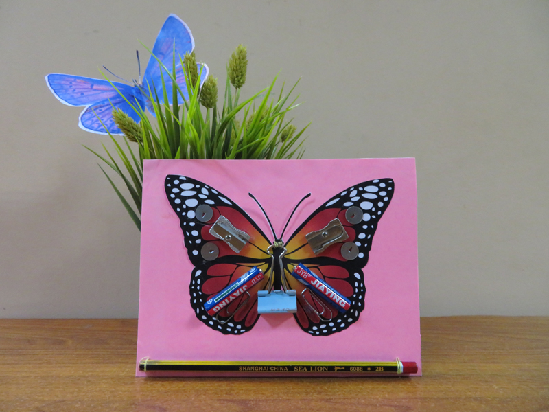 Инсталляция – это объемная композиции из различных предметов, составляющих художественное целое. Она позволяет мыслить по-новому, обогащает мир детской фантазии. Мальчишки и девчонки с удовольствием украсили бумажных бабочек, закрепленных на цветном картоне, различными канцелярскими принадлежностями. Карандаши, точилки, фломастеры, батарейки, кнопки, скрепки, ластики, книжные зажимы уютно разместились на волшебных крыльях наших удивительных красавиц. Выполнять работу легко и просто, а подарок получается оригинальным.