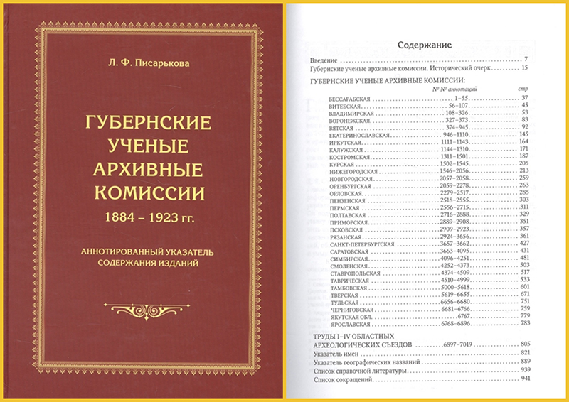 Писарькова Л.Ф. Губернские ученые архивные комиссии, 1884-1923 гг. : аннотированный указатель содержания изданий / Л. Ф. Писарькова. – Москва : Новый хронограф, 2015. – 941 с.