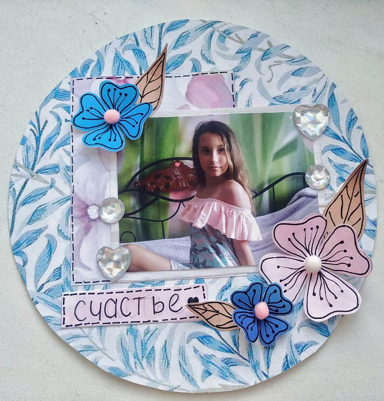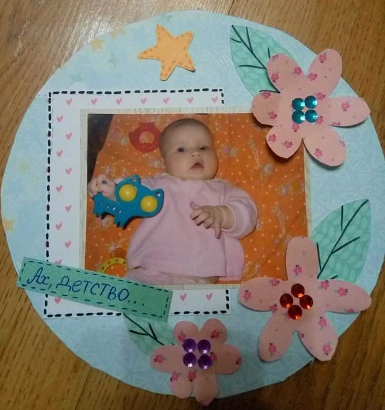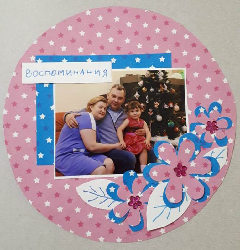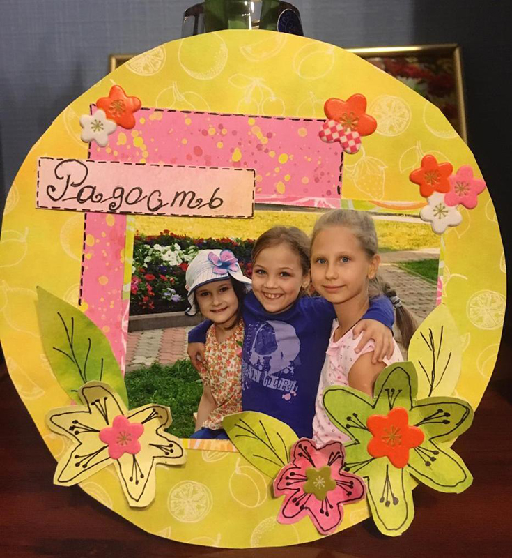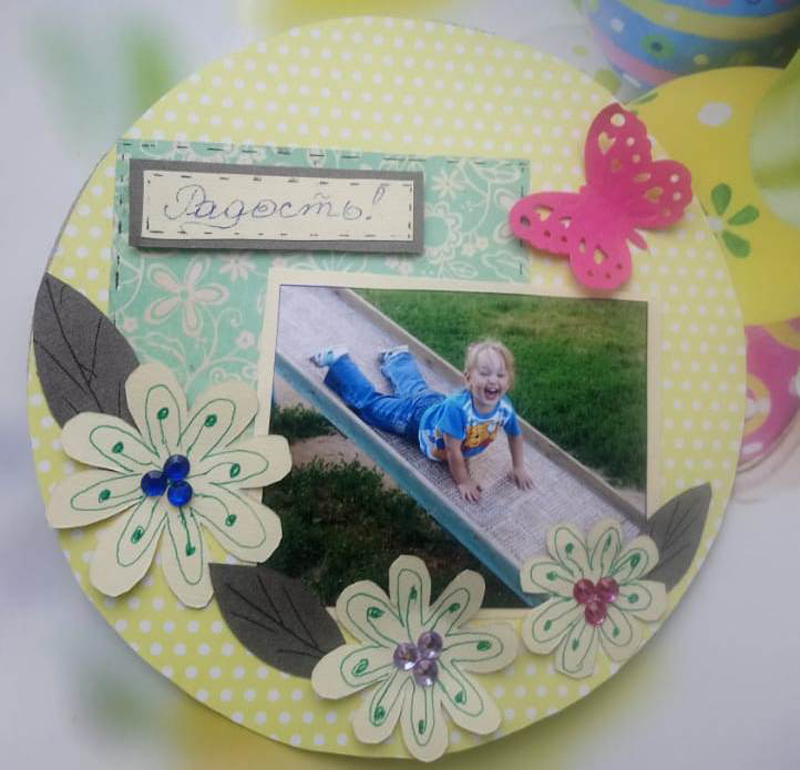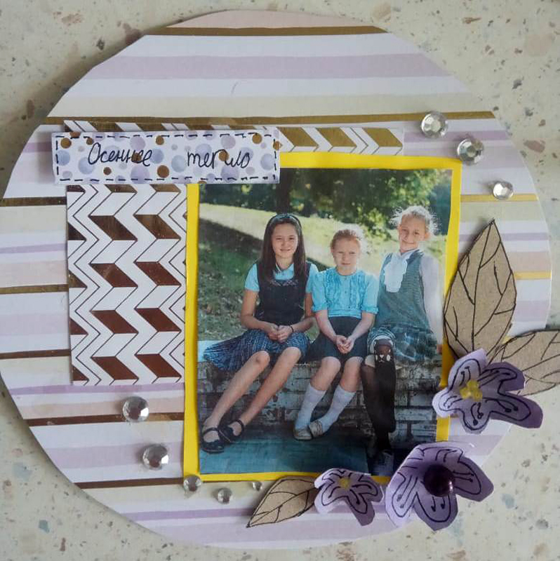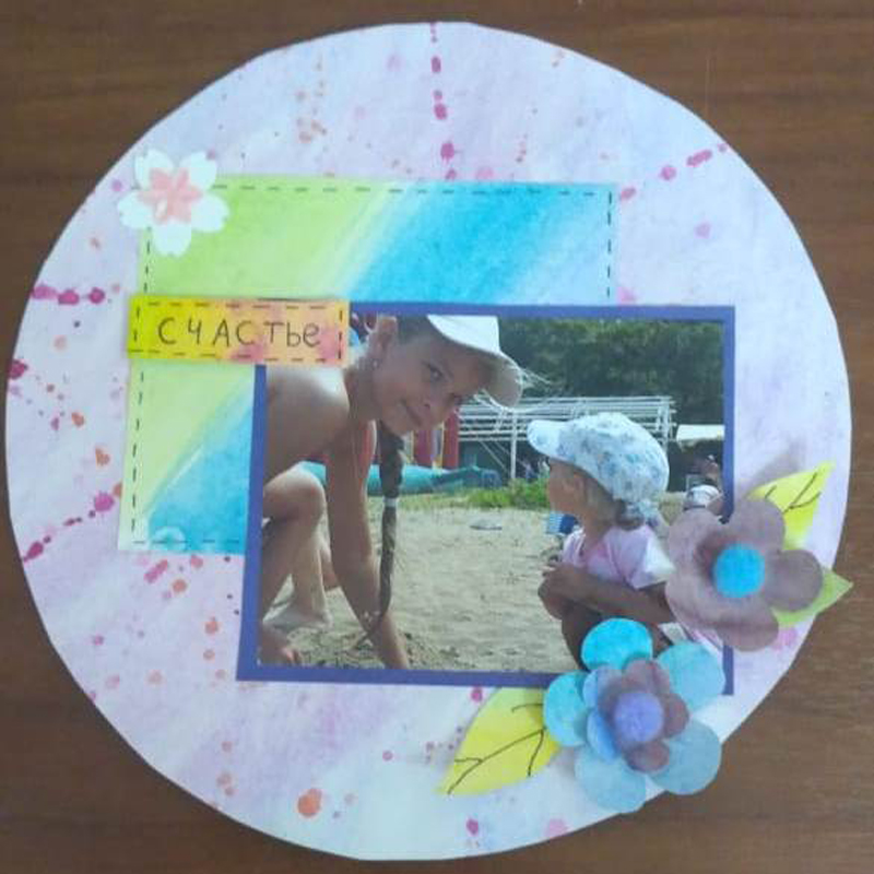 На этот раз рукодельницам предложили изготовить не только страницу альбома для фотографий, но и декоративные элементы. Цветы и листья для украшения фотоснимков нужно было сделать с нуля, то есть нарисовать эскиз, сделать из него шаблон, вырезать и нанести на цветок конкретные детали. Каждый цветочек следовало делать в определенном размере, учитывая цвет бумаги и фотографии, которую они украшают.