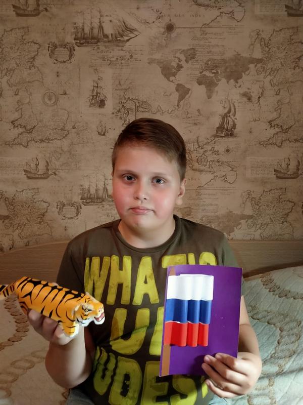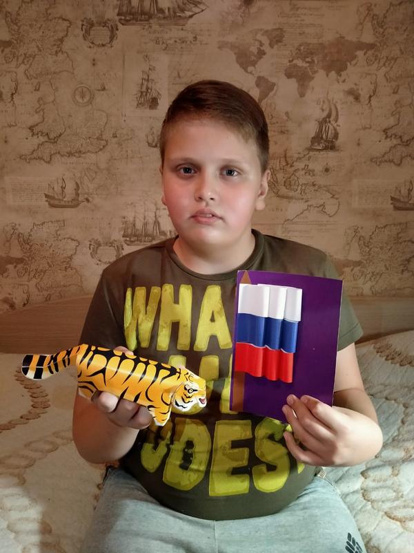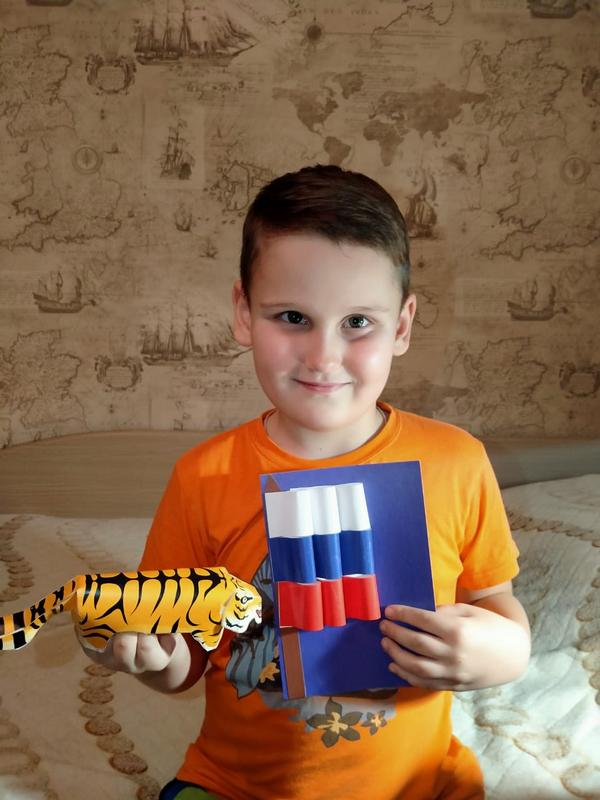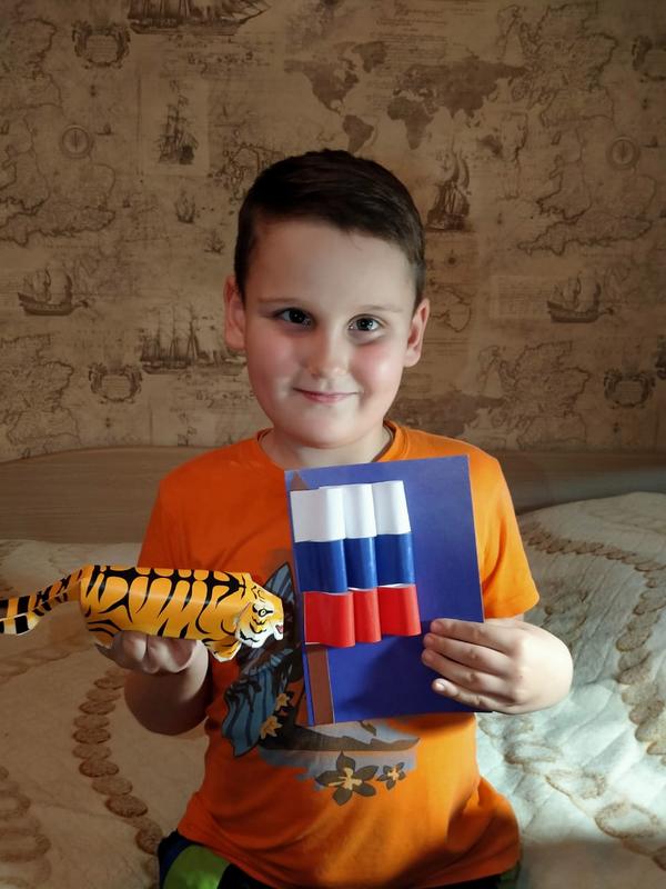 Проявляя свою индивидуальность, мальчишки выполнили достаточно сложную работу: они вырезали, а потом складывали тигра из бумаги. Кроме того, ребята смастерили патриотическую открытку «Флаг России».