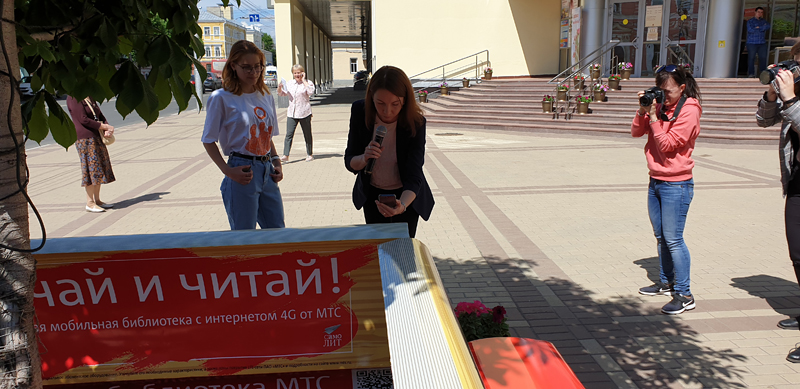 Ведущая мероприятия, заместитель директора библиотеки им. Горького Надежда Чернова предоставила слово для выступления Светлане Максимкиной, которая рассказала о первом совместном проекте – «Мобильная библиотека». Благодаря ПАО «МТС» виртуальные книжные стенды появились не только в городских, но и в центральных районных библиотеках нашего региона. Этот проект успешно реализуется с 2015 года, теперь к «Мобильной библиотеке» добавились «Литературные скамейки».