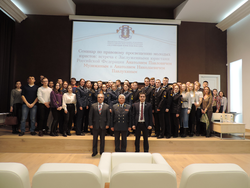 Участниками семинара были будущие правоведы, студенты и курсанты Академии ФСИН, РГУ имени С.А. Есенина, Рязанского филиала Московского университета МВД России им. В.Я. Кикотя, Рязанского филиала Московского института имени С.Ю. Витте. Всего на встрече присутствовало более 90 человек. Гостями встречи были заслуженные юристы Российской Федерации Анатолий Павлович Музюкин и Анатолий Николаевич Павлухин.