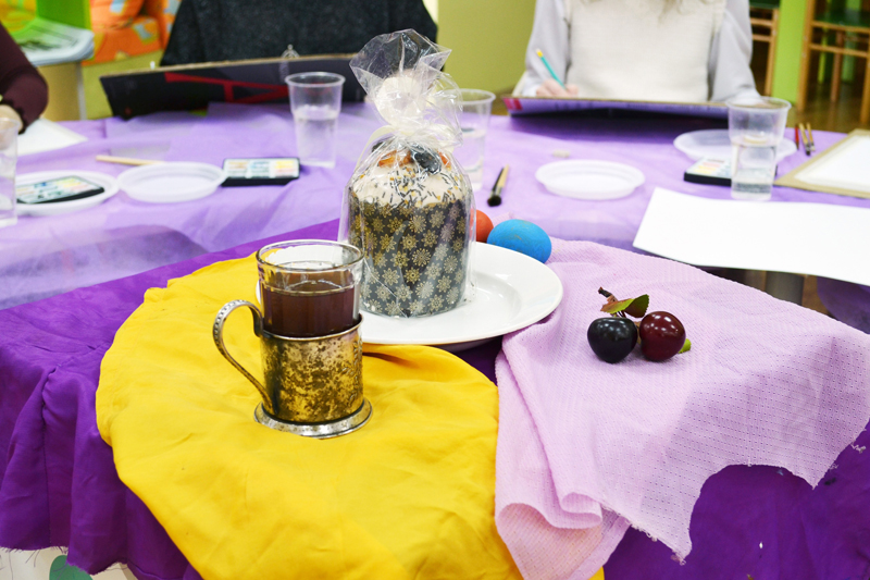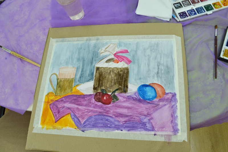 На занятии участники вместе с преподавателем писали натюрморт на пасхальную тему, что было весьма актуально, так как мастер-класс проходил в преддверии празднования Пасхи.