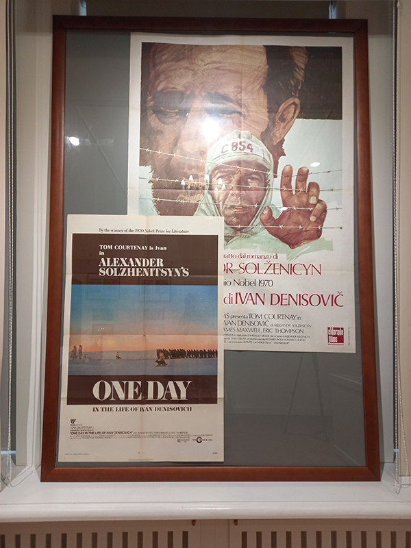 Экспозиция включает более 30 предметов из коллекции музея-заповедника. Зрелищным ядром выставки являются две подлинные цветные киноафиши к зарубежным фильмам по роману А.И. Солженицына «Один день Ивана Денисовича», презентующие зрителю общий уровень понимания смысла солженицынской прозы западным общественным мнением 50-летней давности. Посетители также могут увидеть фотографии со съемок фильмов, раритетные, в том числе зарубежные, издания книг писателя.