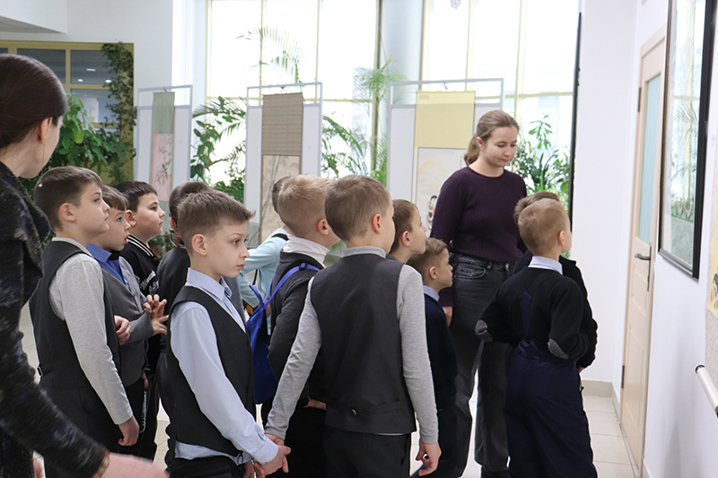 На выставке известной китайской художницы Ван Сюлин юные гости библиотеки познакомились с традициями национальной китайской живописи гохуа. Их заинтересовали работа «На лотосовом пруду» самой художницы и работа Ланы Лазориной «Пион».
