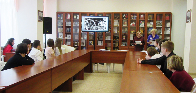 Сотрудники кафедры периодических изданий рассказали школьникам о том, как создавались фильмы по произведениям К.М. Симонова, какие актеры и режиссеры принимали в них участие, в каких условиях снимались киноленты, рассказывающее о грозных событиях в истории нашего Отечества, о подвиге народа. Библиотекари остановились подробно на таких художественных и документальных фильмах, как «Парень из нашего города», «Жди меня», «Живые и мертвые», «Бессмертный гарнизон», «Возмездие», «Шел солдат». На встрече были показаны кадры из этих фильмов, прозвучали стихи и отрывки из прозаических произведений Симонова.