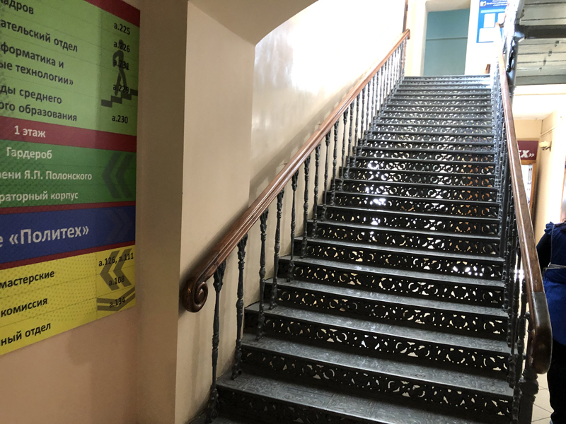 В здании бывшей мужской гимназии ребят поразила сохранившаяся с давних пор чугунная лестница. По ней не раз проходили в XIX веке не только рязанские гимназисты, но и представители императорской фамилии, литератор В. А. Жуковский и многие другие известные всей России персоны. Памятная доска на здании напомнила ребятам о других великих уроженцах Рязанского края, окончивших в разные годы XIX и XX века мужскую гимназию, ставшую местом первого поэтического успеха гимназиста Якова Полонского. В заключение экскурсии сделали фото на память у скульптуры поэта, установленной в сквере имени Полонского в мае 2018 года.