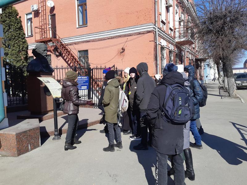 На соседней улице участники экскурсии увидели храм. Именно в нем юный Яков Полонский по воскресным дням иногда пел в церковном хоре. По пути к зданию бывшей мужской гимназии, которую окончил Яков Полонский, остановились у бюста М. Е. Салтыкова-Щедрина на улице Николодворянской и вспомнили, как связано имя великого русского сатирика с нашим городом.