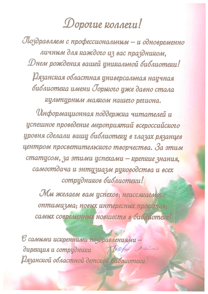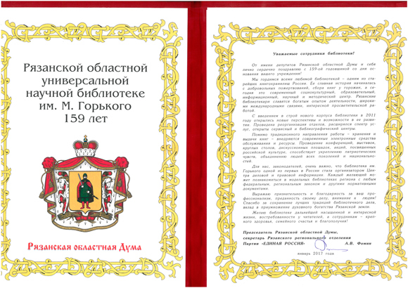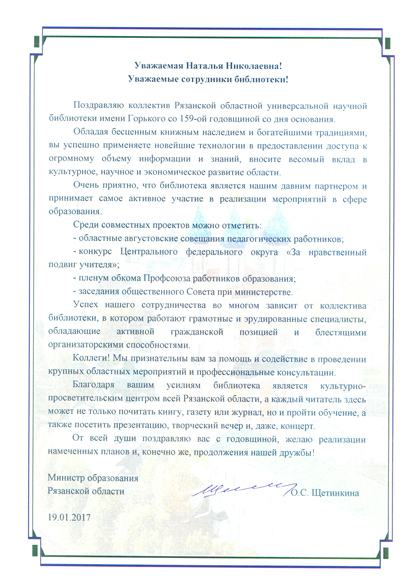 Высокая оценка деятельности библиотеки прозвучала в выступлениях вице-губернатора – первого заместителя председателя Правительства Рязанской области С.В. Филимонова, депутата областной Думы Т.Н. Панфиловой, первого заместителя министра культуры и туризма Рязанской области М.В. Горожановой, министра образования Рязанской области О.С. Щетинкиной, заместителя министра по делам территориальных образований и общественных объединений Рязанской области В.Н. Коробкина, заместителя директора областной детской библиотеки С.С. Вайло, директора областной специальной библиотеки для слепых О.А. Луневой, председателя миссионерского отдела Рязанской епархии, протоиерея Арсения Вилкова, руководителей национальных общественных объединений.