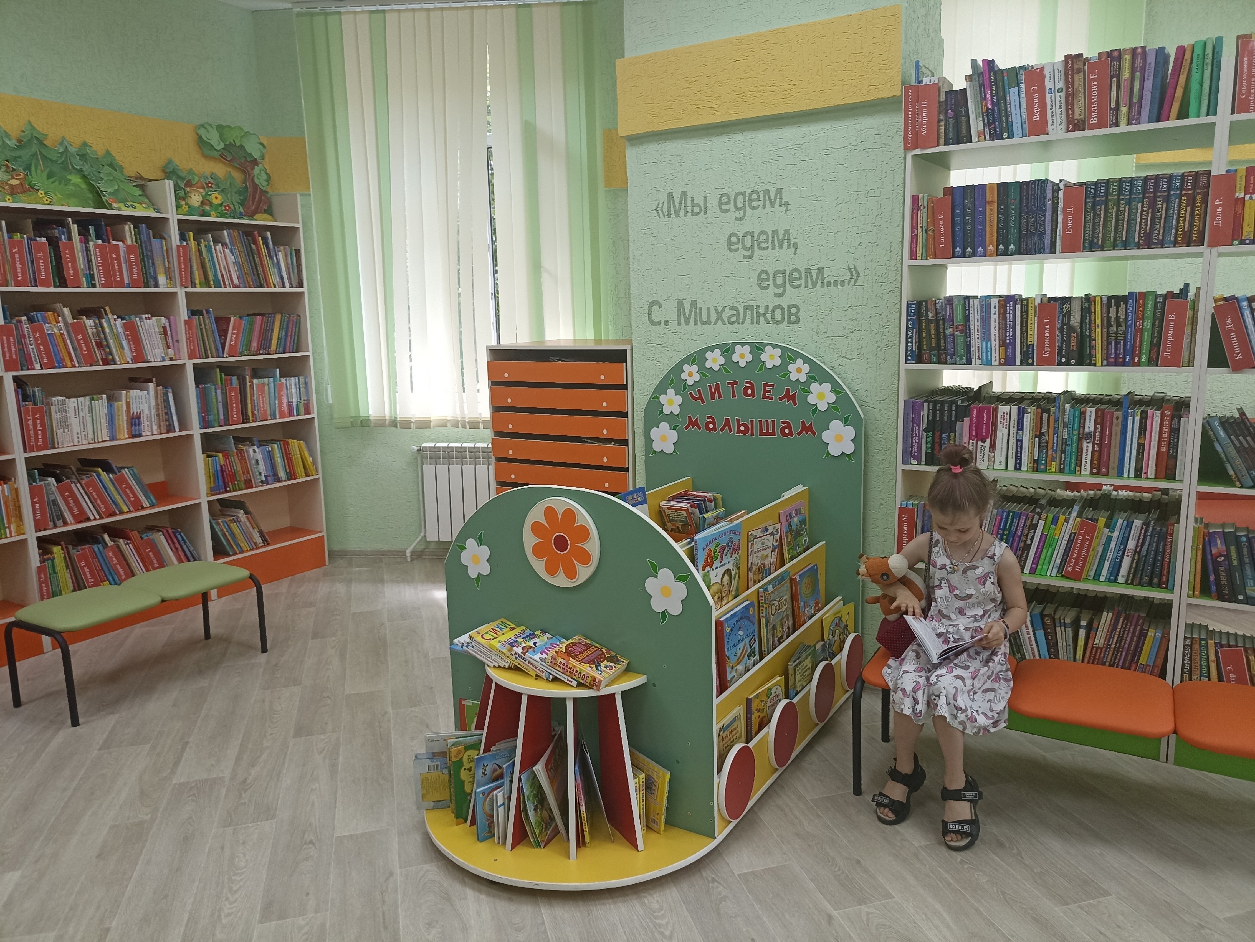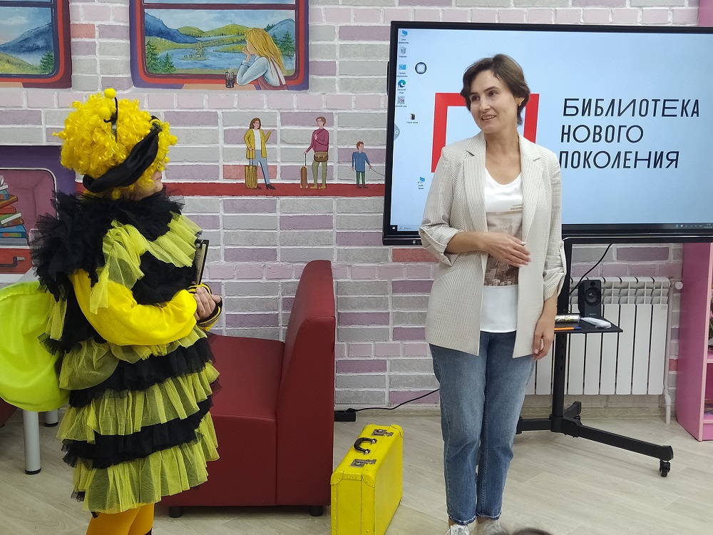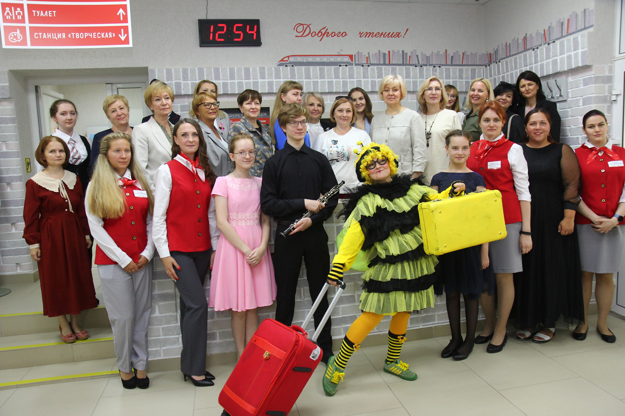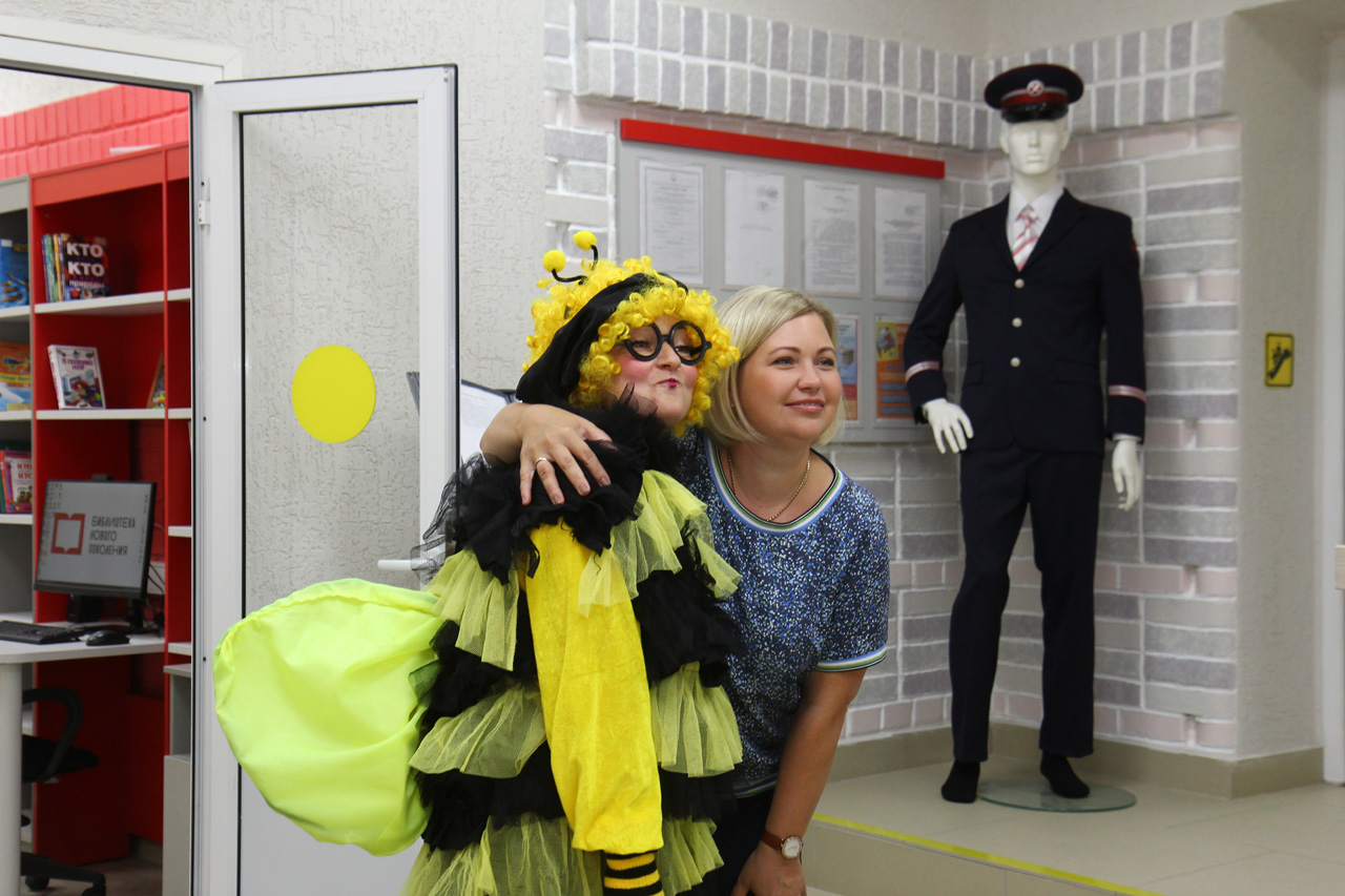 В день открытия гостей встретили библиотекари, читатели-активисты и ведущая праздника в образе сказочного персонажа – Пчелки Майи. Они пригласили участников церемонии пройти по новым залам и ознакомиться с пространством модельной библиотеки, в дизайн-проекте которой использована железнодорожная тематика и атрибутика, а также цитаты из книг о поездах.
