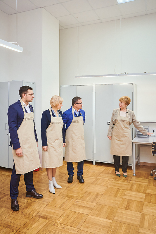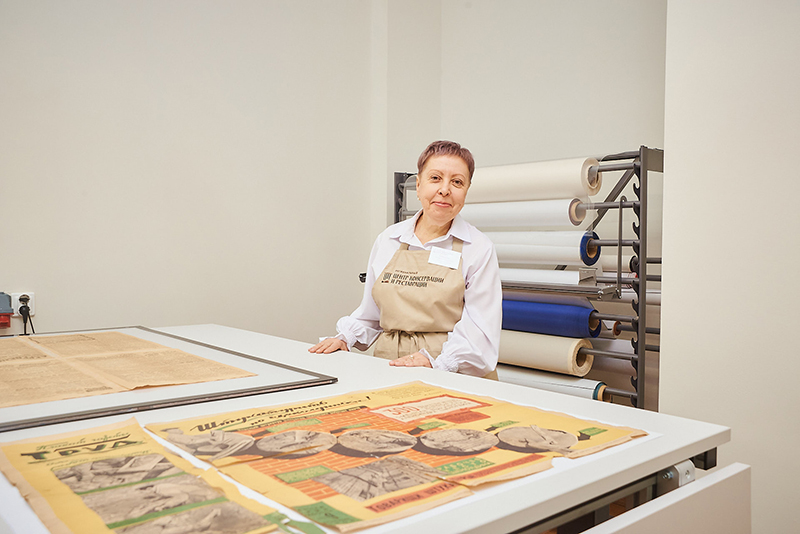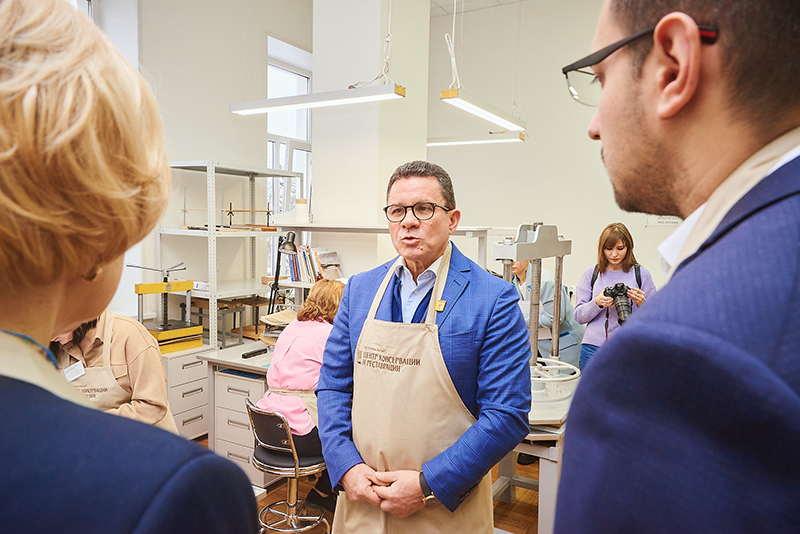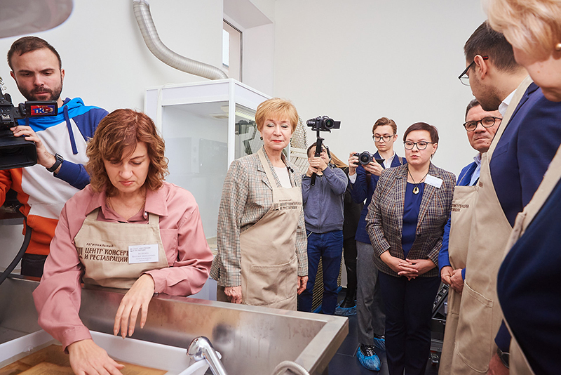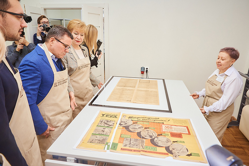 В течение всей экскурсии сотрудники открывшегося центра демонстрировали работу с книжными изданиями, плакатами, документами. В настоящее время в обновленном центре библиотеки работает семь сотрудников: заведующий центром, четыре художника-реставратора, два переплетчика. В октябре – ноябре 2022 года сотрудники Центра прошли обучение по программам дополнительного профессионального образования на производственной базе и учебном реставрационном классе Российской государственной библиотеки.