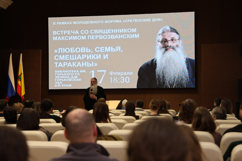 17 февраля в библиотеке имени Горького в рамках молодежного форума «Сретенские дни» прошла встреча с отцом Максимом Первозванским. Гостям была представлена лекция под названием «Любовь, семья, “Смешарики” и тараканы».