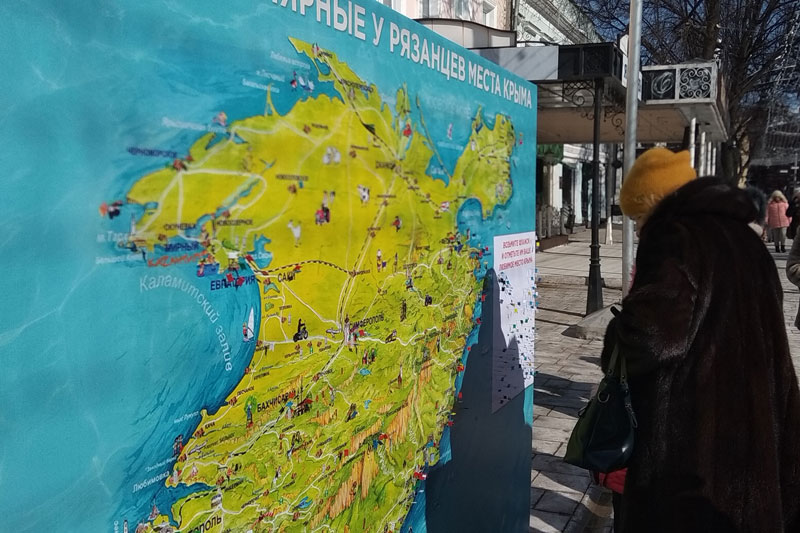 Для горожан работали интерактивные площадки, на которых можно было узнать о достопримечательностях Крыма, полюбоваться работами рязанских художников, посмотреть выступление актеров Театра кукол и отметить любимое место на карте Крыма.