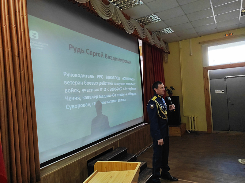 Предваряя лекцию, к собравшимся обратился гвардии капитан запаса Сергей Владимирович Рудь. Он указал на сходство между СВО и конфликтом в Чечне, где в ходе выполнения боевых задач ему, как командиру, приходилось делать сложный выбор между потребностями мирного населения и режимом военного времени. Тогда российским воинам также приходилось отстаивать право на территориальную целостность страны, бороться за жизнь и свободу граждан.