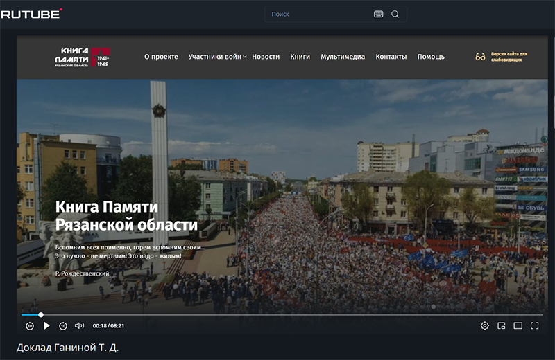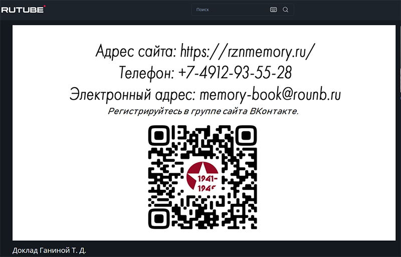В рамках программы круглого стола был представлен видеодоклад заведующей сектором «Книга Памяти Рязанской области» Рязанской областной универсальной научной библиотеки имени Горького Ганиной Татьяны Денисовны.