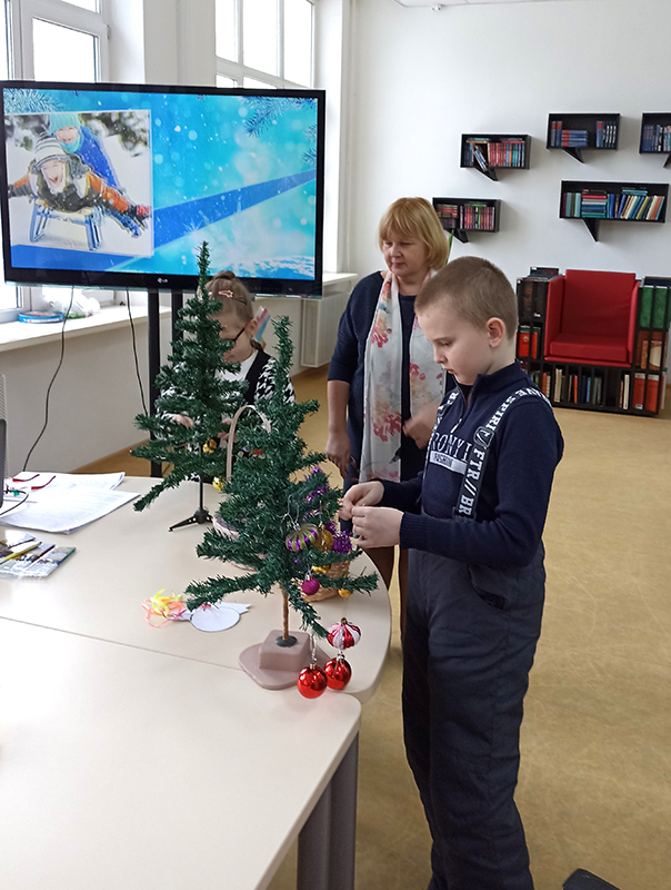 Юные читатели слушали стихи и разгадывали загадки, смотрели отрывки из мультфильмов, участвовали в предновогодних забавах и конкурсах. Для украшения елочки дети смастерили игрушку из бумаги, которая станет подарком для друзей и близких.