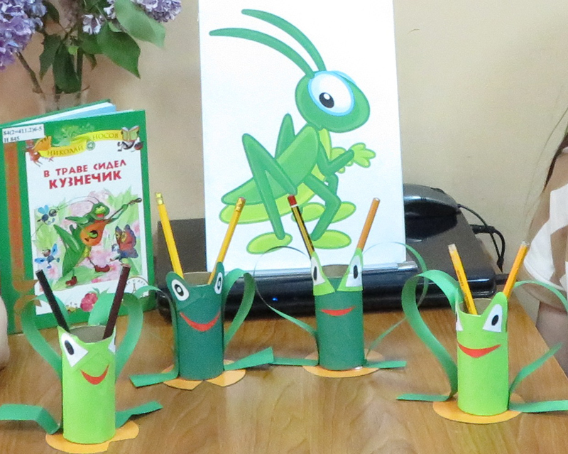 Дети часто теряют ручки, карандаши, фломастеры. Поэтому очень важно иметь карандашницу, чтобы эти канцелярские принадлежности всегда были на месте. На майском занятии клуба «Домовенок» ребятишки изготавливали карандашницу в виде кузнечика из картонных втулок и цветной бумаги.