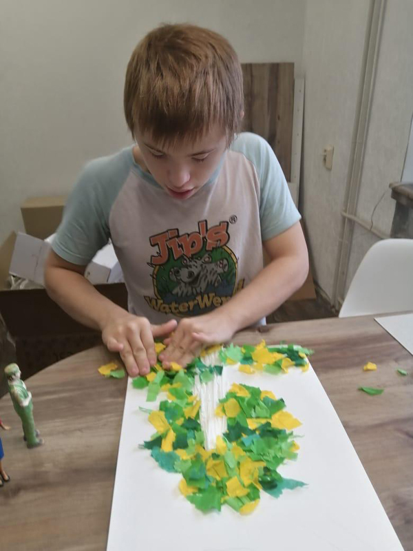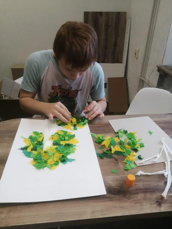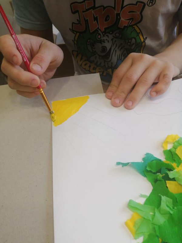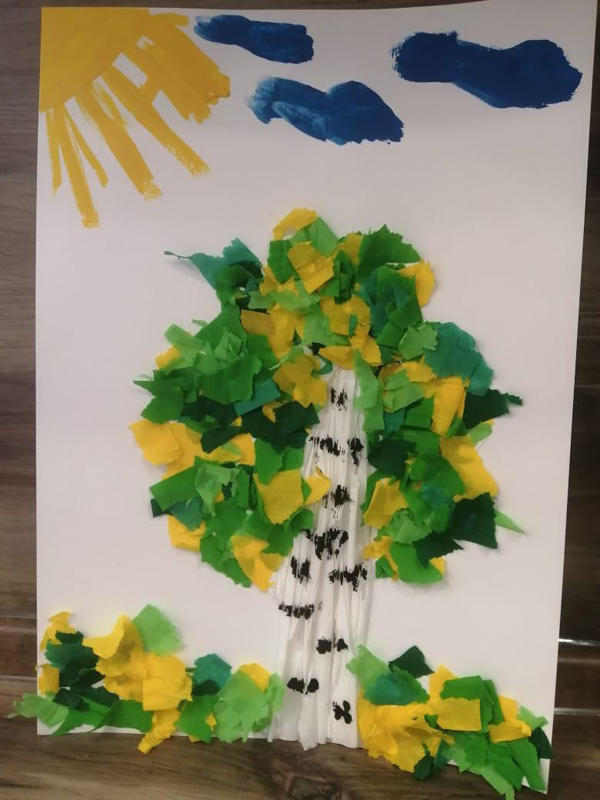 В ходе занятия ребята с удовольствием погрузились в творческий процесс: раскрашивали гуашью солнышко и облака, увлечено рвали и скручивали разноцветную бумагу, а потом склеивали ее, создавая форму «есенинской» березы.