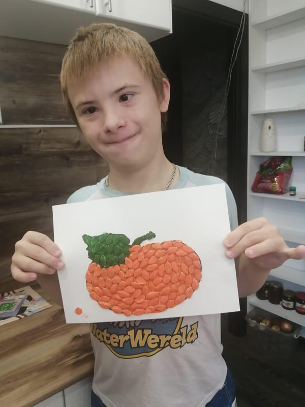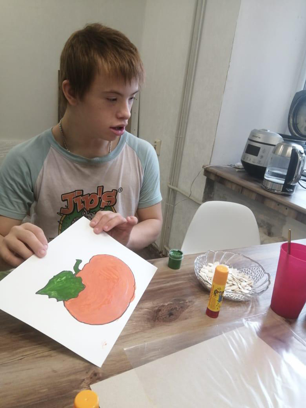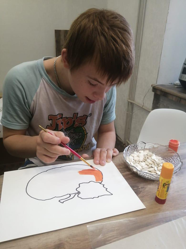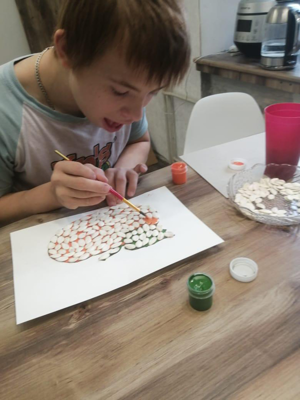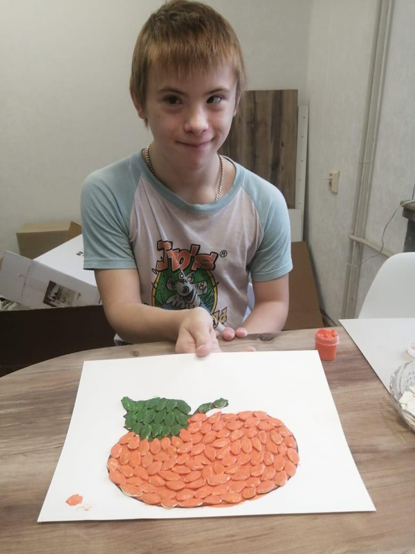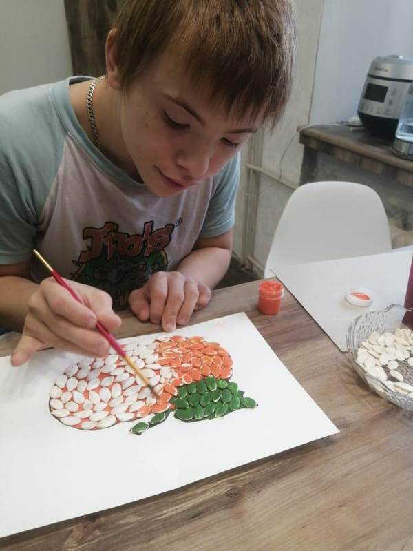 Проект «Коробка вдохновения» продолжается! На очередном онлайн-занятии Денис Бутнев под чутким руководством волонтера принял участие в мастер-классе «Тыква» (аппликация из тыквенных семечек).