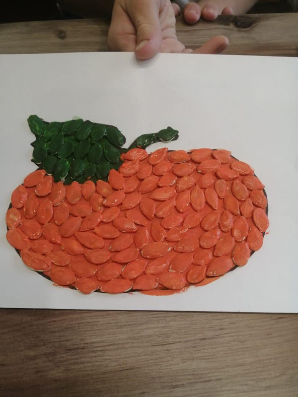 Сначала мальчик раскрасил тыкву акварельными красками, а затем наклеил семечки и раскрасил их. Результат получился впечатляющий! Кроме того, у Дениса было домашнее задание: раскрасить портрет. С поставленной задачей он отлично справился!