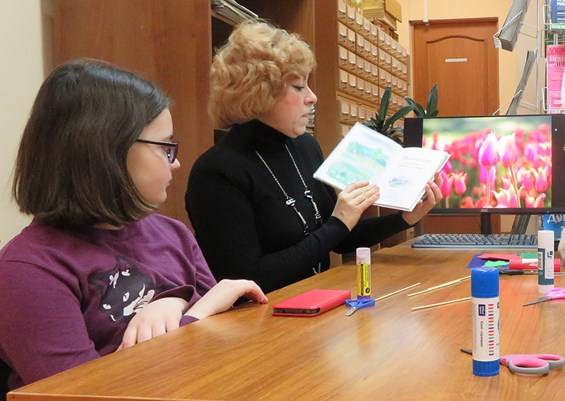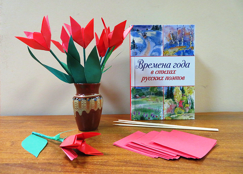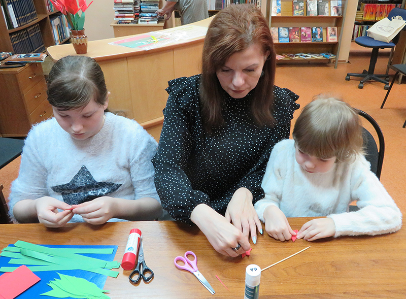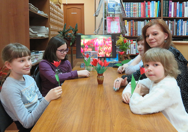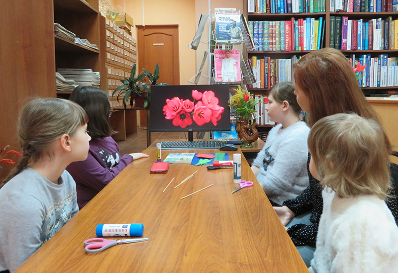 Красота тюльпана радует глаз. Ребята посмотрели видеоролик «Как распускаются тюльпаны» и познакомились с легендой о прекрасном цветке. Участники клуба, используя клей, ножницы, бамбуковые шпажки и двустороннюю цветную бумагу, смастерили очаровательные тюльпаны –весенние подарки мамам и бабушкам.