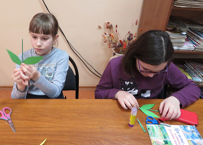 На мартовском занятии клуба выходного дня «Домовенок» наши маленькие друзья изготавливали из цветной бумаги тюльпаны.