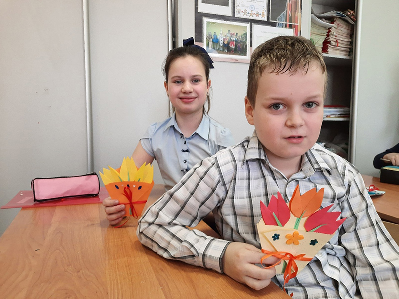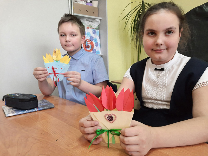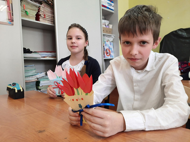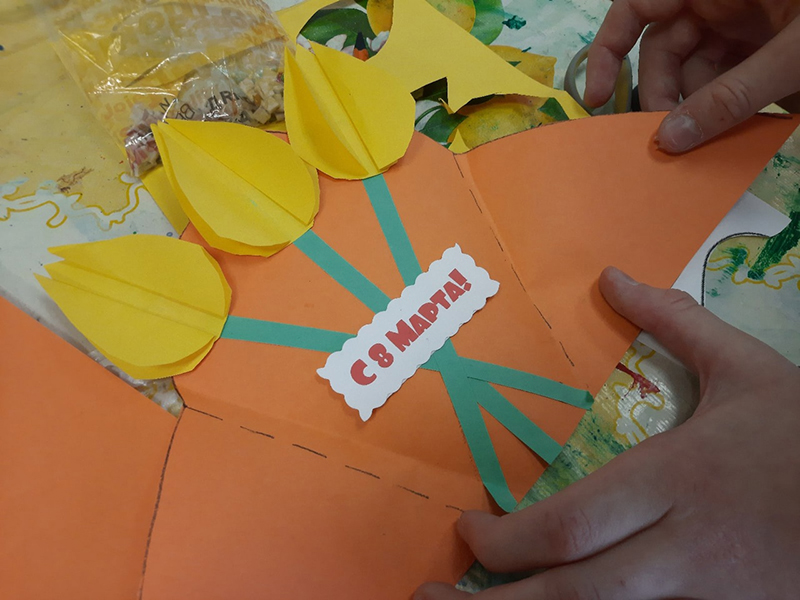 Мальчишки и девчонки своими руками сделали оригинальный подарок. Для того, чтобы работа получилась красивой, им пришлось изрядно потрудиться: аккуратно вырезать из бумаги нарисованные шаблоны, рассчитать количество цветов для создания объемных тюльпанов, собрать в одно целое все элементы сувенира.