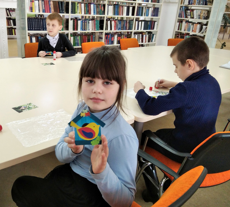Юных читателей познакомили с птицами нашего края, рассказали о прилетающих весной в нашу местность птицах, об их привычках. Дети отвечали на вопросы викторины, вспоминали сказки и произведения о птицах, участвовали в конкурсах «Угощение для птиц», «Птички-синички». Ребята поделились своими рассказами о том, как они заботятся о птицах: развешивают на деревьях самодельные кормушки, угощают птиц во дворе нежареными семечками, подсушенным белым хлебом. Во время мастер-класса дети сделали аппликацию из цветной бумаги «Пернатые друзья».