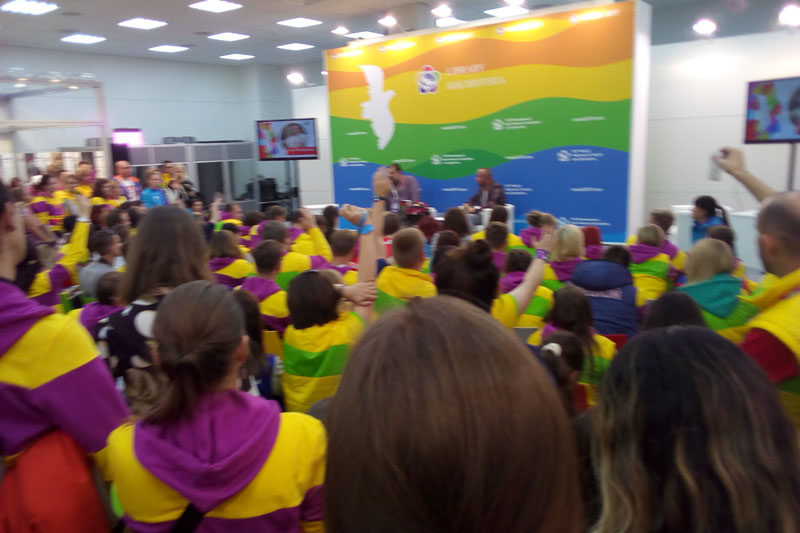 Это были первые слова, которые я услышала, когда приехала из горнолыжного комплекса «Роза Хутор» в Олимпийский парк, а именно в медиацентр, где работали почти все образовательные площадки и организовывались встречи. По правде сказать, медиацентр был немного похож на базар, где кто-то что-то продает, кто-то призывает присоединиться к чему-то, кто-то просто громко разговаривает. И вся толпа куда-то идет или стоит в длинной очереди, которой нет конца. Шум со всех сторон сразу обволакивает тебя и ошарашивает. Чувство страха, когда ты идешь в потоке и думаешь только о том, чтобы не сбиться и не упасть… Именно таково первое впечатление.