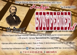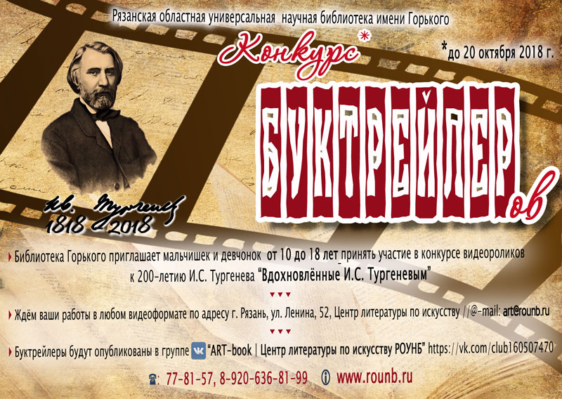 Региональный конкурс буктрейлеров «Вдохновленные И.С. Тургеневым», посвященный 200-летию Ивана Сергеевича Тургенева, русского писателя-реалиста, поэта, публициста, драматурга, переводчика, члена-корреспондента императорской Академии наук, почетного доктора Оксфордского университета, почетного члена Московского университета, продлен до 20 октября 2018 года.