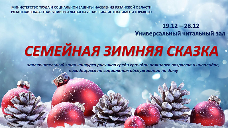 На площадке областной библиотеки имени Горького представлены рисунки на конкурс «Семейная зимняя сказка» среди граждан пожилого возраста и инвалидов, организованный министерством труда и социальной защиты населения Рязанской области.