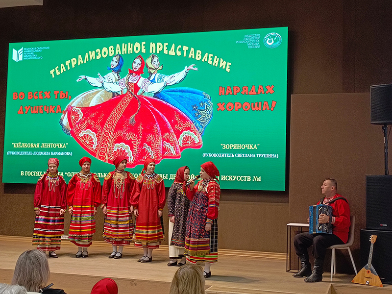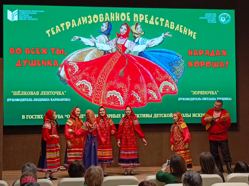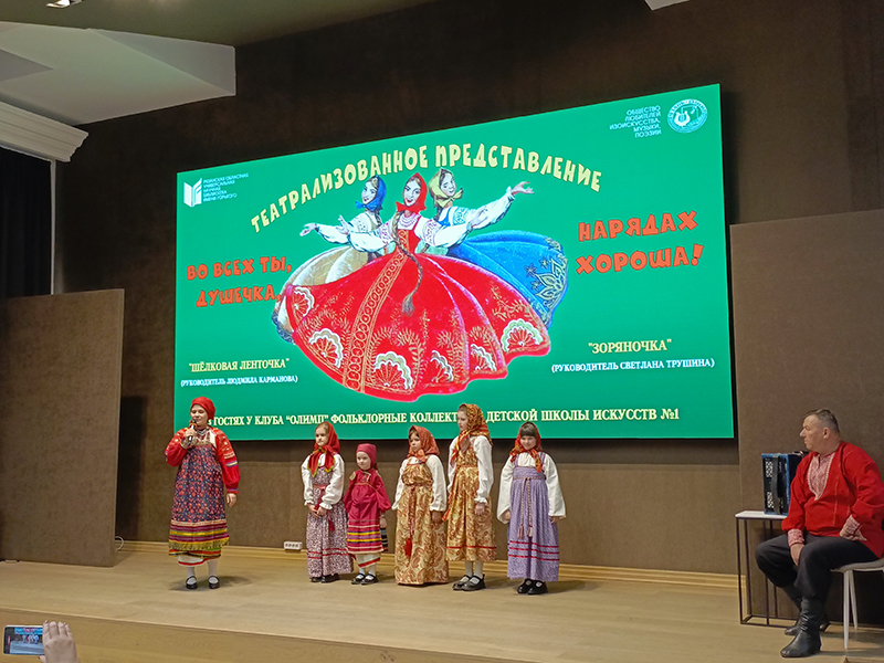 Сегодня в клубе «ОЛИМП» состоялось театрализованное представление «Во всех ты, душечка, нарядах хороша», которое показали фольклорные коллективы Детской школы искусств № 1 г. Рязани «Зоряночка» (руководитель Светлана Трушина) и «Шелковая ленточка» (руководитель Людмила Карманова).