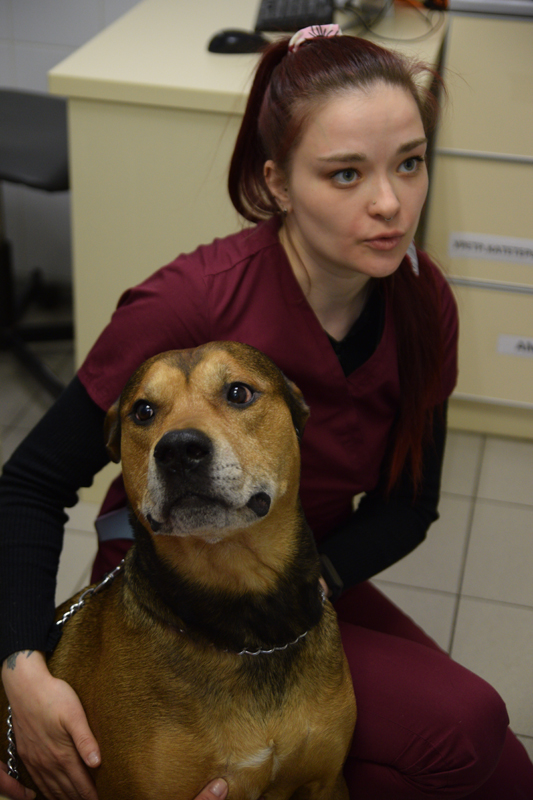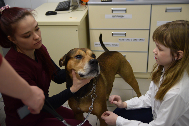 Ульяна лично провела осмотр собаки по кличке Гром. С помощью ветеринарного врача, девочка смогла измерить температуру питомца, осмотреть голову и шею, оценить состояние кожного покрова и т.д.