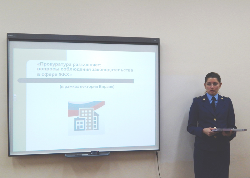 В гостях у участников лектория была прокурор отдела управления по надзору за соблюдением федерального законодательства прокуратуры Рязанской области Юлия Николаевна Калинина, которая в своем выступлении пояснила собравшимся, как пользоваться своими жилищными правами, какие службы необходимо привлечь к устранению появляющихся время от времени проблем, какие нормативные документы действуют в регионе.