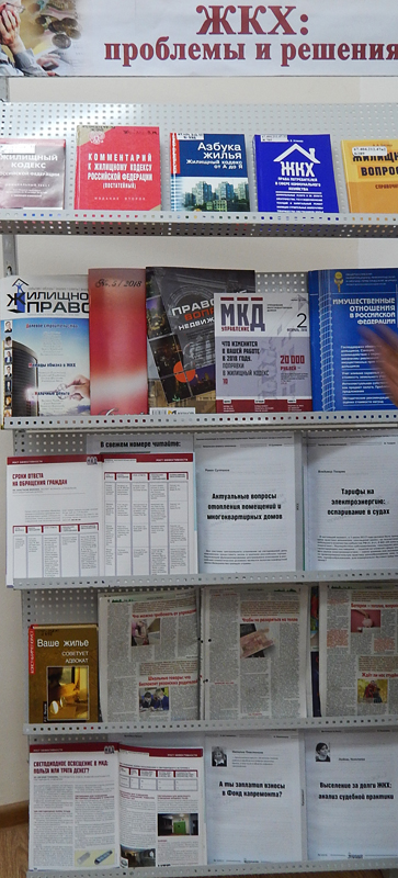 Библиотека, будучи крупной, заметной общественной площадкой региона, является одновременно и консультационным центром, и держателем фондов, в том числе правовой тематики. Краткий обзор выставки из фондов зала периодических изданий «ЖКХ: проблемы и решения» представила Вера Анатольевна Буковская. Журналы, представленные на выставке, по окончании встречи были с интересом изучены.