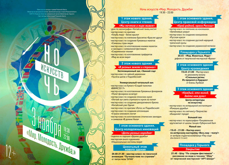 3 ноября Рязанская областная универсальная научная библиотека имени Горького в очередной раз присоединилась к Всероссийской акции «Ночь искусств». В этом году встречу приурочили к одному из самых ярких событий осени – XIX Всемирному фестивалю молодежи и студентов, проходившему в Сочи с 14 по 22 октября.