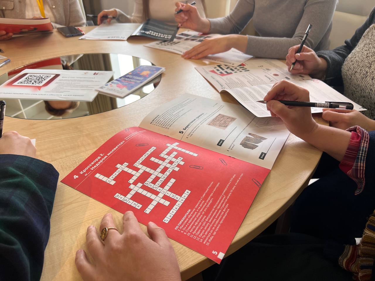 Сотрудники библиотеки в течении 45 минут отвечали на вопросы кроссворда. Они проверили свои знания об исторических событиях, освежили в памяти забытые факты. Для того, чтобы решить кроссворд, не нужно специальных исторических знаний: достаточно школьной программы, азарта и умения мыслить логически.