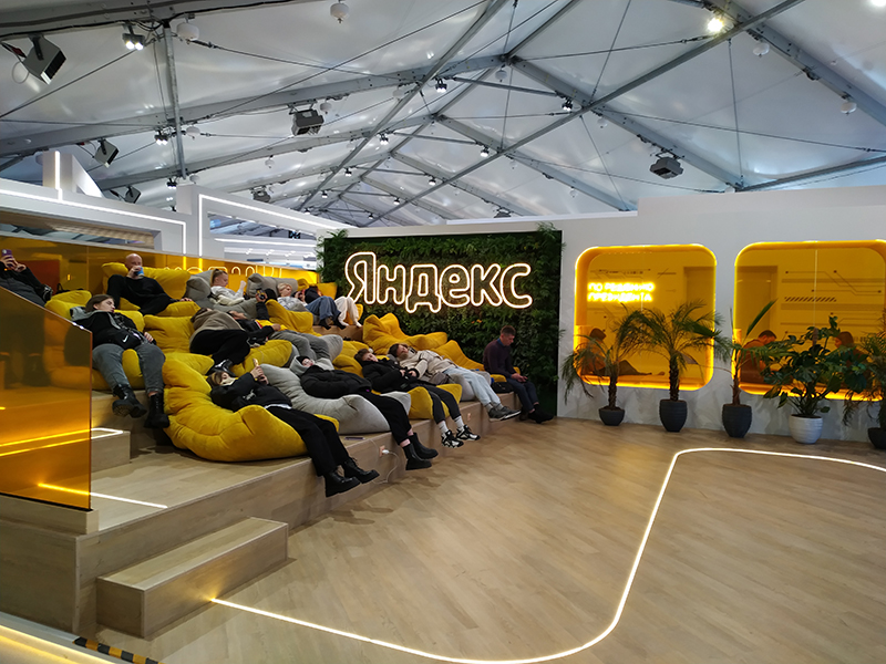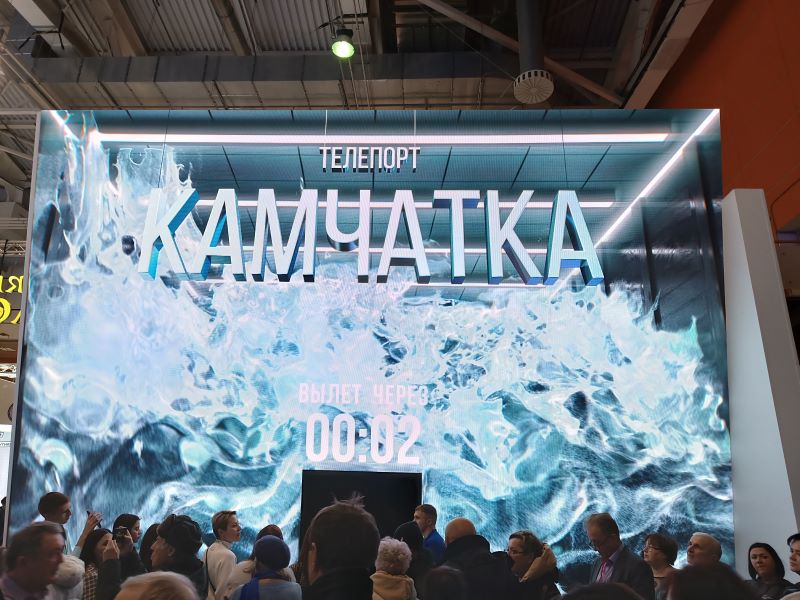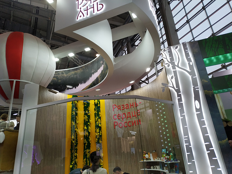 Ну и, конечно, мы торопились посетить площадку родной Рязанской области. Отметили, что на ней кратко и емко представлено то, чем славится регион. Сразу обращает внимание длинная очередь из желающих совершить путешествие на воздушном шаре.