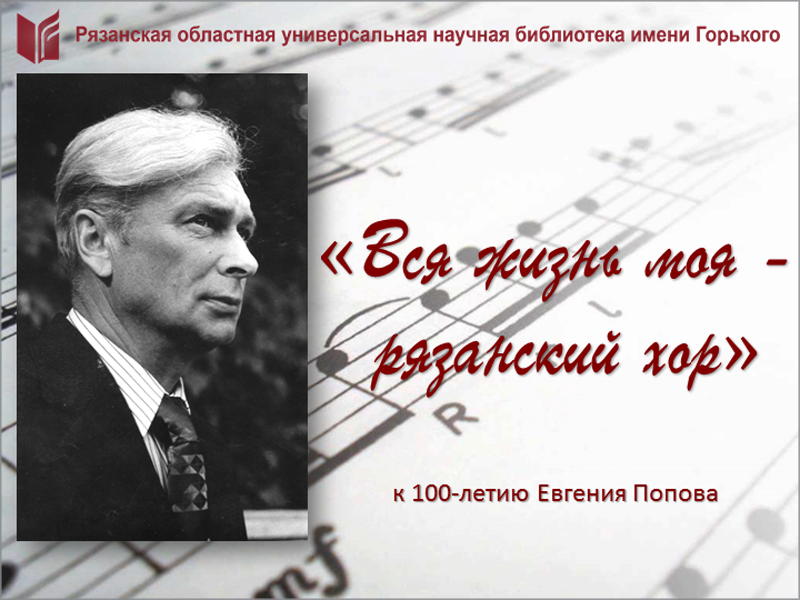 19 марта – 100 лет со дня рождения Евгения Григорьевича Попова – выдающегося деятеля русской музыкальной культуры, народного артиста РСФСР, участника Великой Отечественной войны, 38 лет возглавлявшего Государственный академический рязанский русский народный хор, который носит теперь его имя.