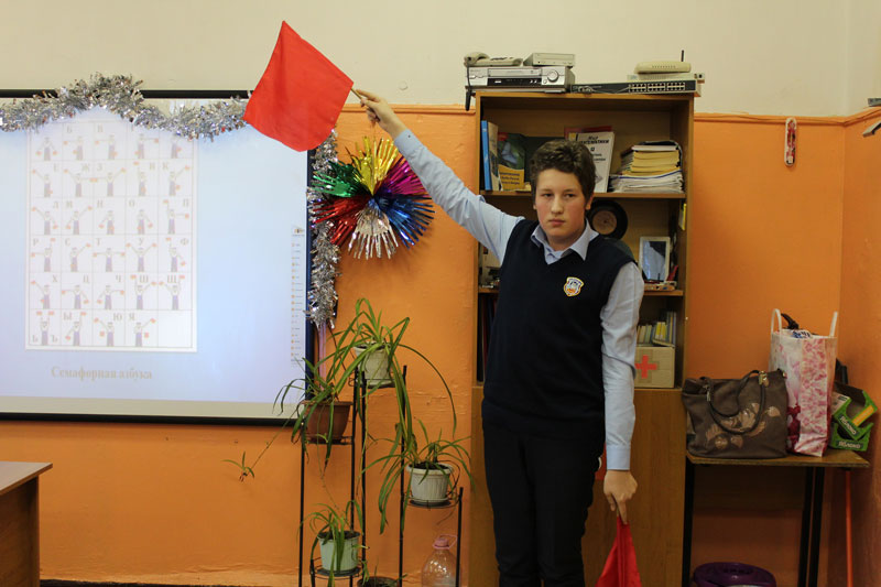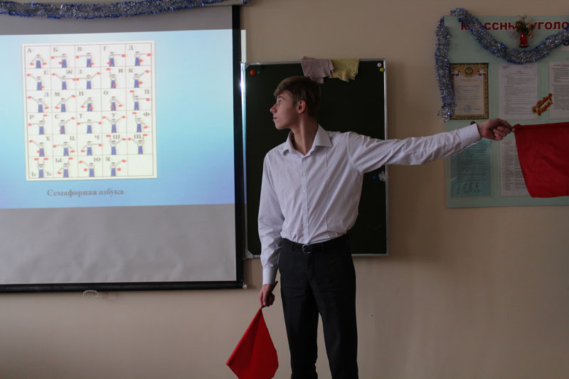 На примерах этих сражений ведущая вместе с учениками вспомнила историю России и ее великих защитников. Так, Павел Степанович Нахимов во время Синопского боя находился на флагманском корабле, который был пробит вражескими снарядами. Он не покидал свой пост, осуществляя тактику, сформулированную главным командиром Черноморского флота вице-адмиралом Михаилом Петровичем Лазаревым: «Сам погибай, а товарища выручай». В самые трудные моменты Нахимов направлял далеко стоящие корабли на помощь тем, кто находился под огнем неприятеля. Ребята с интересом слушали рассказ ведущей, отвечали на вопросы, знакомились с семафорной азбукой.