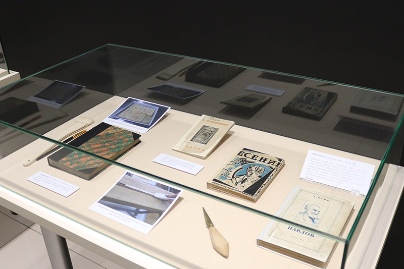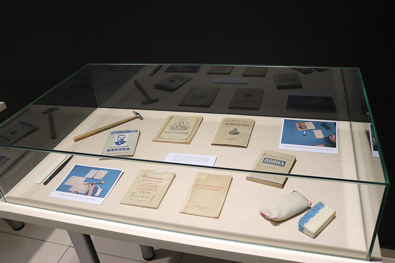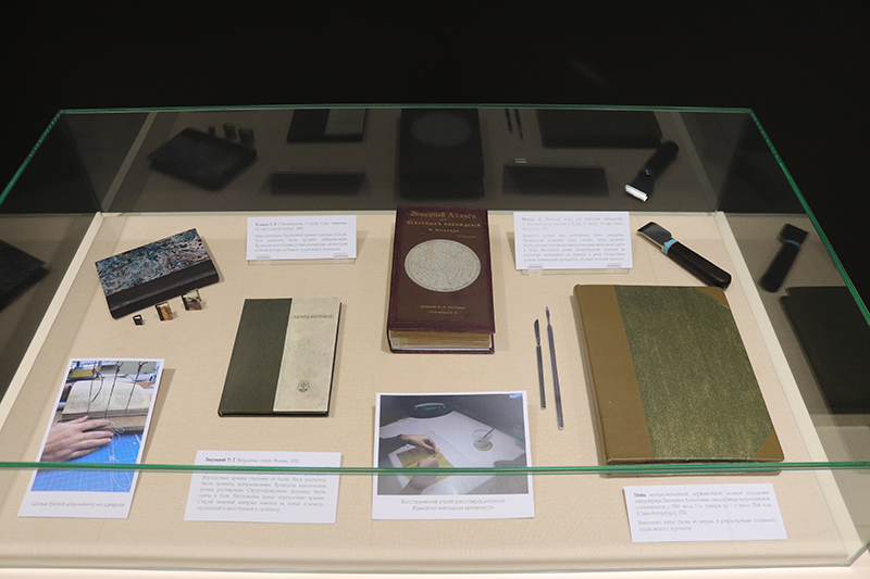Экспозиция дополнена инструментами и материалами, которые используют в работе реставраторы библиотеки, а также фотографиями с процессами реставрационных работ.