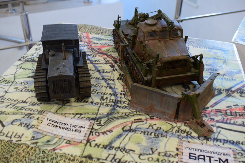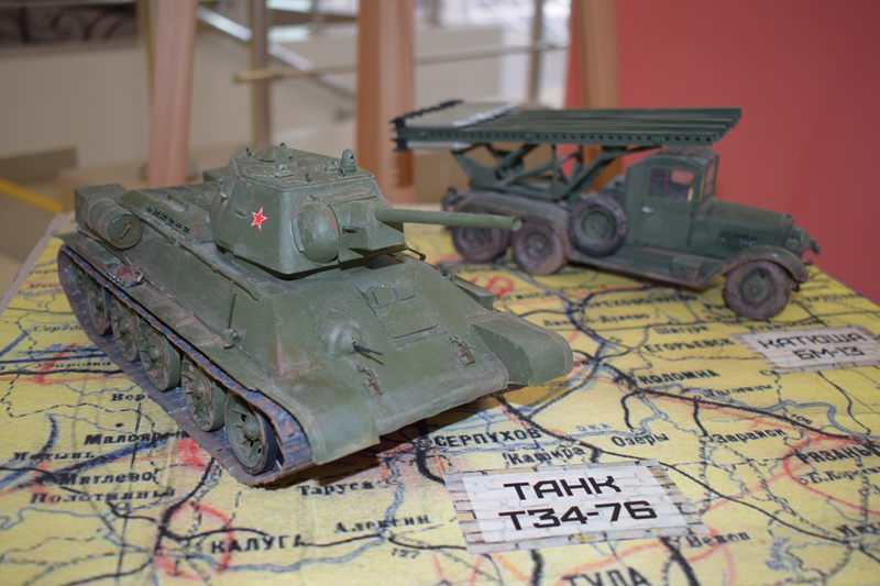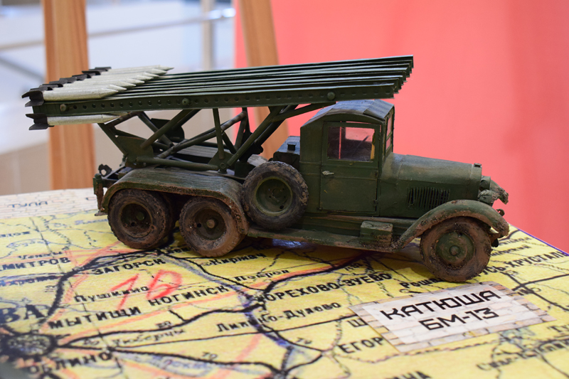 В экспозиции 16 моделей: миниатюры грузовых автомобилей и тягачей, путепрокладчик, бензозаправщик, танк Т-34, легендарная артиллерийская установка «Катюша».