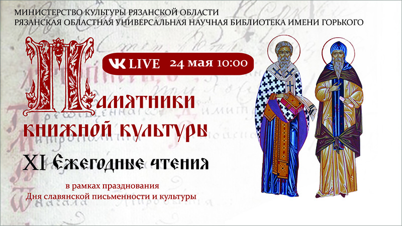 24 мая 2023 года в Малом конференц-зале Рязанской областной универсальной научной библиотеки имени Горького состоялись XI Ежегодные чтения «Памятники книжной культуры». Они приурочены к празднованию Дня славянской письменности и культуры, дню памяти святых Кирилла и Мефодия и посвящены знаменательным датам в истории книгопечатания. Их цель – привлечь внимания к вопросам сохранения и изучения мирового культурного наследия и национальных ценностей, обсудить результаты научно-исследовательской работы, обменяться опытом и расширить сотрудничества между учреждениями культуры, образования и науки.
