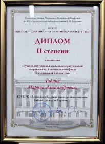 Марина Тябина была награждена дипломом II степени в номинации «Лучшая виртуальная выставка патриотической направленности по материалам фонда Президентской библиотеки».