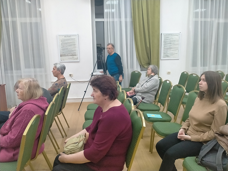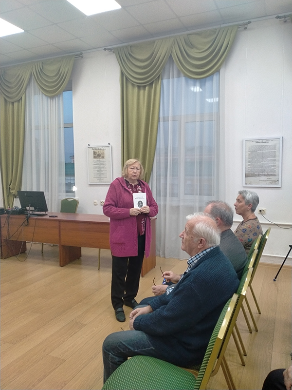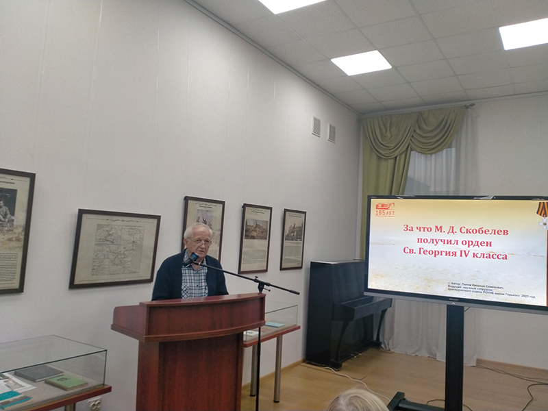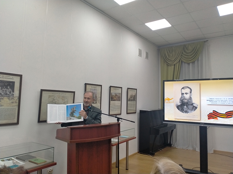 Ученый секретарь библиотеки имени Горького, член Совета Рязанского областного отделения Русского географического общества, кандидат исторических наук Владимир Анатольевич Горнов представил членам клуба краеведов документальный фильм «Рассвет Белого генерала», подготовленный участниками экспедиции по местам среднеазиатских походов М.Д. Скобелева. Фильм был снят студией «Инноко филмз» в 2022 г. Владимир Анатольевич познакомил гостей с фотоальбомом экспедиции и сувенирами, изготовленными для участников юбилейных торжеств.