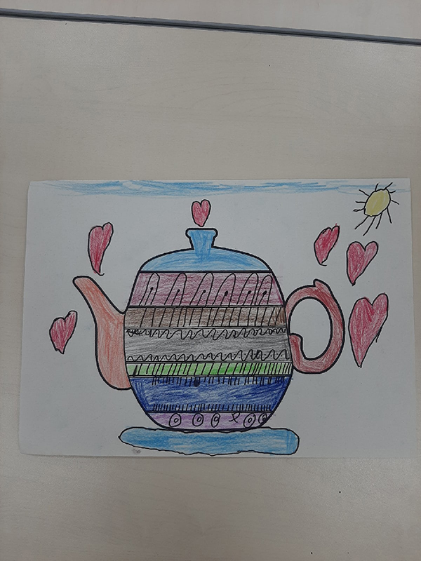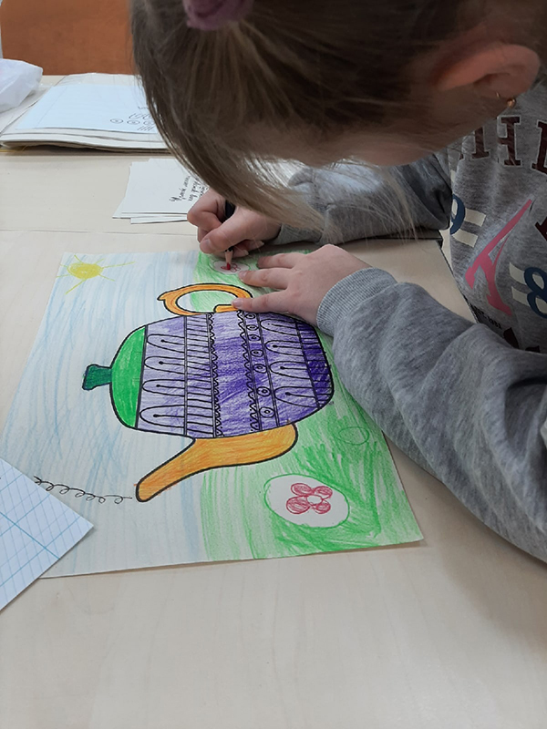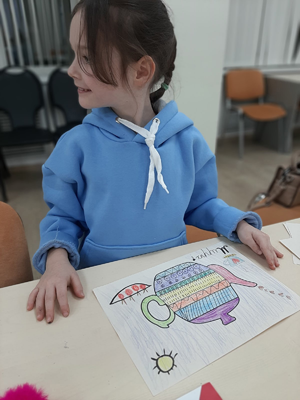 Преподаватель с ребятами играли в «Ухо-нос» (специальное упражнение на координацию), разминали пальцы, отхлопывали ритм, учились слушать команды, а потом нарисовали каллиграфический чайник. Таким образом, в игровой форме была проведена начальная диагностика.