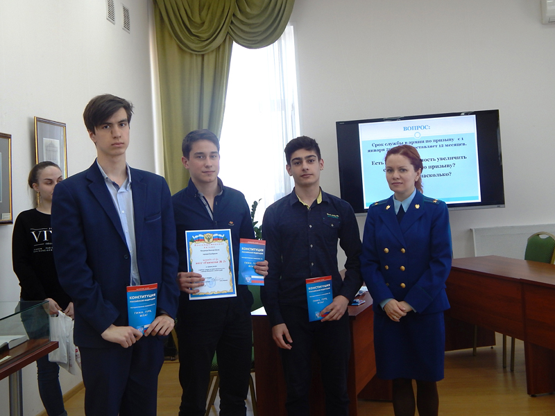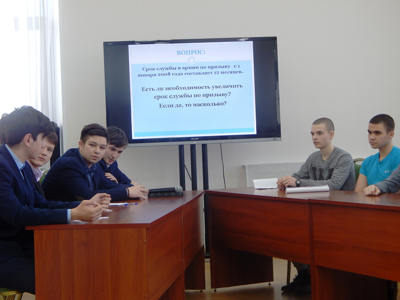 Проводила командную игру старший помощник прокурора области по правовому обеспечению Мария Сергеевна Нетыкс. Соревнование проходило в формате дебатов поочередно между двумя командами. Ребята обосновывали свою позицию по разным вопросам: необходимо ли увеличить призывной возраст, правомерно ли предоставление отсрочки от призыва гражданину, являющемуся доктором или кандидатом наук, есть ли необходимость введения дополнительных отсрочек от призыва на военную службу.